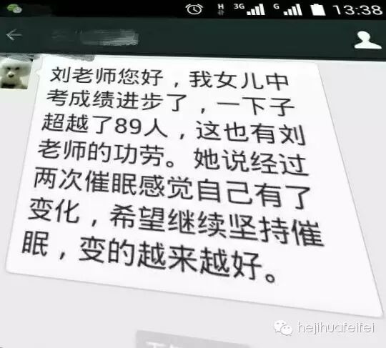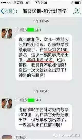 我自2013年1月接受催眠培训已经两年多了,催眠上百人,催眠时数500小时以上,那些来找我催眠的孩子,厌学的回去上学了,想休学的也不提休学了,而在提高学习成绩方面,我可算是有多个成功个案的催眠师了。还记得去年中考,初四复读的男孩,遭受着抽动困扰,经过十多次的催眠,中考成绩从上一年的400多分提高到650分,考上了理想的高中;前天得知来我这里催眠两次的高二女生中段考年级进步89名,平时较弱的科目数学竟然考了110分;广州另一位催眠师同学为中考的女儿催眠两次,孩子的数学也考出来惊人的成绩。
