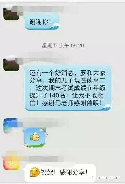 下面这张图片提到的高二男孩与我家男孩同年同月同日生,而且与马春树老师生日同一天!发微信的是他的妈妈,家在山东淄博,也是马老师美式催眠工作坊同学,学习催眠比我晚一些,两个催眠师妈妈相见恨晚,通了长长的电话,分享亲子心得。她曾经是教育局领导,如今在一所学校任校长,心理学专业。她从寒假开始,执着地为儿子做催眠,孩子状态越来越好,阳光,快乐,开朗,学习成绩不断提升,她的催眠实践最先用在了自己孩子身上,取得了意想不到的效果。