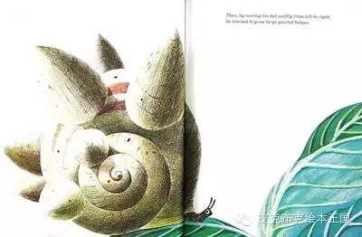 可是,这只小蜗牛根本不听它爸爸的话,它躲在一片很大的卷心菜叶下,扭啊扭的,这样扭,那样扭,后来,它发现了让房子变大的好方法。