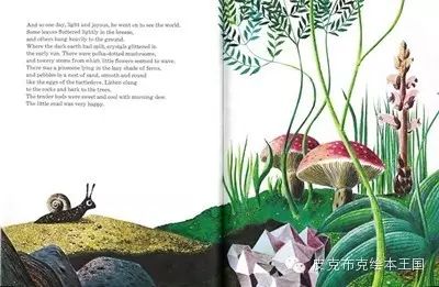 于是有一天,它背着自己的房子出发了,他轻轻松松、高高兴兴地上路去看世界了。有些叶子在微风中轻轻摇摆,有些叶子沉沉地垂向地面。在黑土地裂开的地方,水晶在晨曦中闪闪发光。那边有几个红底点的蘑菇,还有些像塔一样高高耸立的花茎,顶上的小花仿佛正向人招手。一颗松果躺在蕨草那像花边一样漂亮的阴影里,一堆鹅卵石躺在沙床上,光滑圆润,就像斑鸠蛋。岩石披着苔藓,树木裹着树皮,柔嫩的花蕾蘸着晨露,芳香清凉。小蜗牛非常快乐。