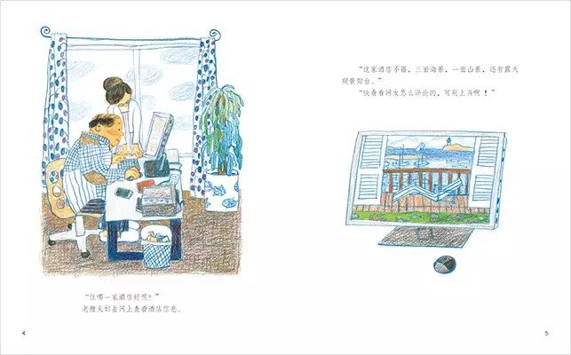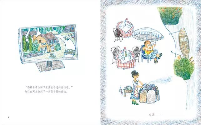 朱成梁的代表作《团圆》,色彩艳丽,突显中国画的大气,而这部《老糖夫妇去旅行》则淡雅随意,突显中国风的轻灵,写意自然,以绘本特有的轻捷、简朴、幽默的文学和图像叙事,来传递作者和绘者对生活的观察和思索。这样多重意义的层叠及其多重读解的可能,正是一大批优秀的儿童图画书的艺术长处。