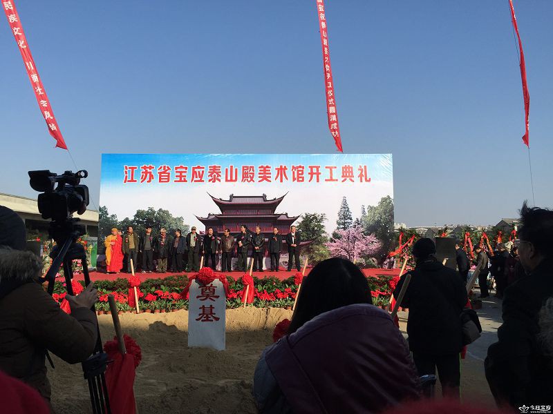 12月9日上午9点38分,江苏省宝应泰山殿美术馆奠基开工。国家民政部、文化部等部门负责人、县统战部副部长王健、县文体广新局副局长朱俊岭、宝应博物馆馆长倪学萍等及多家公司负责人出席了此次开工奠基仪式。 仪式上,宝应宁国寺方丈清纯法师发表了讲话,感谢社会各界对重建泰山殿的帮助。之后,来自东南大学的教授张志远先生表示,将在宝应泰山殿美术馆落成之际,捐献出自己的1500幅书画作品,丰富宝应泰山殿美术馆的展陈。 宝应泰山殿历经沧桑 据《宝应县志•康熙志》记载:“泰山殿,在晏公庙旧址。明嘉靖四十年建。一曰碧霞宫,殿宇弘敞,楼阁辉映,为江淮巨观”。明隆庆、万历、清康熙、光绪年间陆续增建,遂形成前后殿宇七进,占地二百余亩,殿房三百余间,佛像数千尊的“宝坊金刹”。整个泰山殿建筑群巍峨壮观,层层殿阁金碧辉煌,檐牙高啄,画栋雕梁,气势极为宏伟,其香火之盛为东南数省之冠。 泰山殿始建于明嘉靖四十年,曾经是宝应境内最大的庙宇,本为江淮巨观,名播大江南北。乾隆皇帝下江南,路过宝应,见其雄伟不凡,赞叹不已,挥毫写下了“天下第一名山”匾额,立于泰山殿牌坊之上。 泰山殿旧址在安宜镇北牌楼口附近,在历史上遭遇过火灾,遭遇过战乱,在抗日战争时毁于日本人的炮火。大雄宝殿与石牌坊毁于20世纪六十年代。1960年,泰山殿最后一间建筑——碧霞宫被拆除。 2013年正式重建 经过多年项目化筹备和市场化运作,2013年,泰山殿重建工程正式启动。目前游客中心已经完工,三门殿、文殊殿、普贤殿和碧霞宫等四大殿的基础平台也已建成,重建后的泰山殿将再现盛景。整个泰山殿古建筑群总规模近10万平方米,投入近10亿元,预计2018年建成并对外开放。重建的泰山殿依托泰山殿古寺,分佛文化展示区和综合文化服务区两大板块。从空中鸟瞰,泰山殿总体成南北轴线布局,重建后的泰山殿历史文化景区将成为京杭大运河上一道靓丽的历史人文景观。 泰山殿文化底蕴深厚