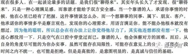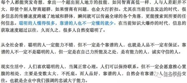 这么多年接触了很多聪明人,的确通过聊天满受益的,无论他们现在是否与我合作,当初有些观点是对我们有帮助的。但是合作以后发现,太聪明的人想的是自己的利益大于一切,久而久之,很难长久共事。至少心中有一种困惑,为什么我们比其他人给予他的更多,但总是不能满足他们的需求。现在回头看一看,还是靠谱的人很重要,无论跟他们共事,还是交朋友(当然也包括,男、女朋友),是诚实的,一是一、二是二的做事,这样做的结果同100%完成任务是同等重要的。因为,不会有意外让你措手不及。