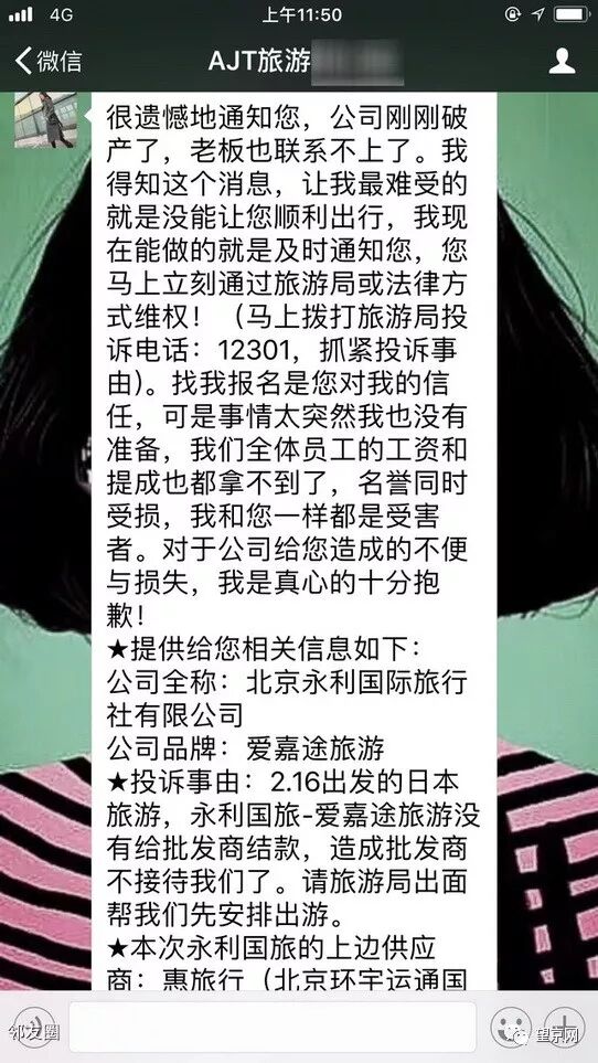 节前我们家通过爱嘉途旅游(北京永利国际旅行社有限公司)华彩门市预订了春节期间的出国七日游,并全款交了团费。这几天一家人做好了各项准备就等着到时出游,结果今天上午爱嘉途门市的业务人员突然给我发信息,说爱嘉途公司要申请破产而且老板联系不上了!太突然了!简直不可思议!