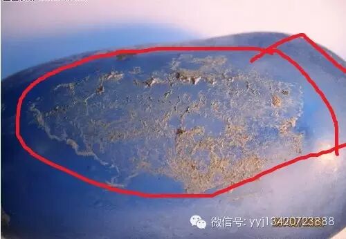三、其实不是白胶,而是我前面说过的那种特利隆处理的结果,有的黑心卖家还往上面作土。这种白胶很恶心,一看就是附着在琉璃表面而不是自然过渡的。各位请自觉避开此类物品。