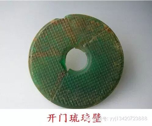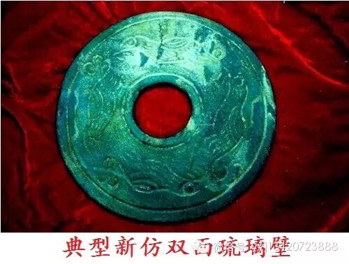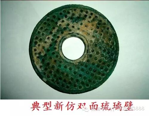对比开门琉璃璧,上图的新仿也有一些钙化痕迹,多半是酸咬的,放大看可以看出来,但是我们无需费这个事了。另外现在有绿色琉璃璧了,大家可以找找酒瓶绿的感觉。