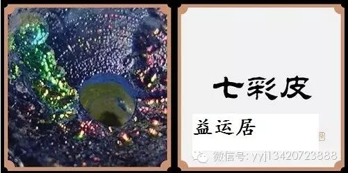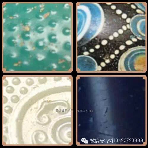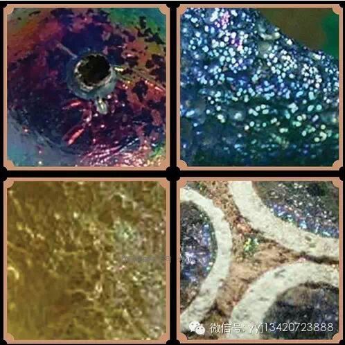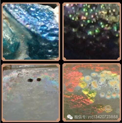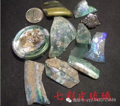二、七彩皮(桑托按:常见于透明或者半透明玻璃制品,如海蓝琉璃耳珰、琉璃器皿、半透明蜻蜓眼等)