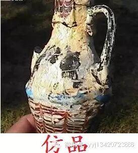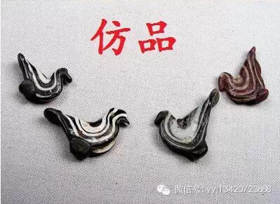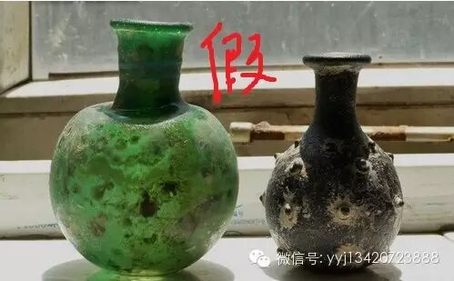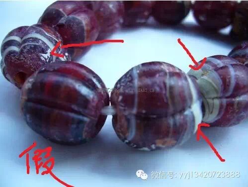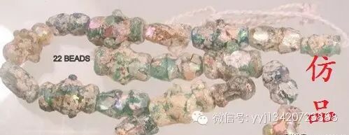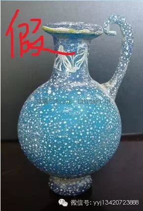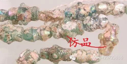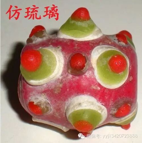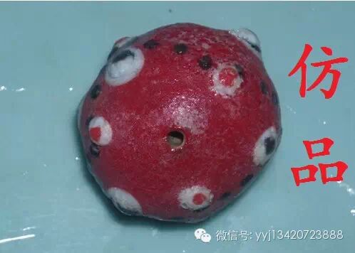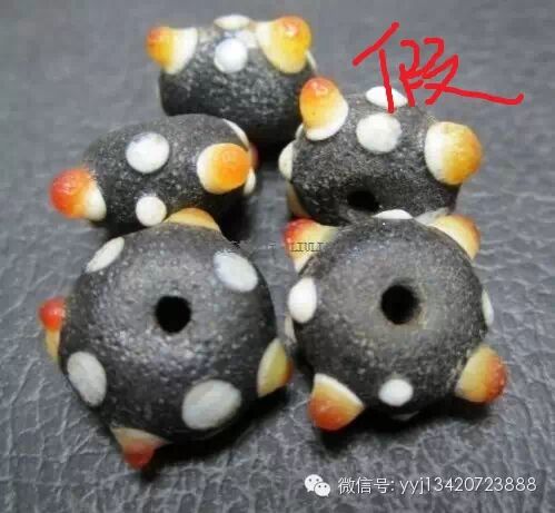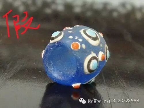 另外一种假货就是制品外表有各种凸起的小点或者条条,有些是仿蜻蜓眼,有些是仿萨珊凸眼琉璃瓶,总之碰到这些垃圾,直接走人。当然贸易珠里面也有这种,请参考上面的讨论。