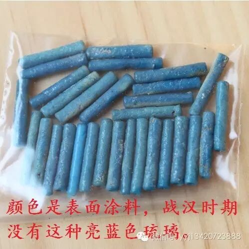 如下图管子表面(埃及新王朝的费盎司珠子,颜色是表面的涂料)的这种亮蓝色,中国战汉时期绝不可能出现!