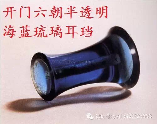 其实这是一个开门六朝的半透明海蓝玻璃耳珰,比较常见的类型,属南方琉璃系统。南方琉璃系统(钾钙琉璃)对比北方琉璃系统(铅钡琉璃)的一个优点就是料性比较长,所以保存状况也比较好。