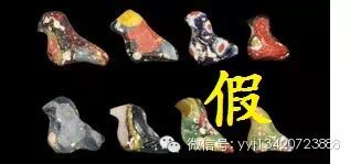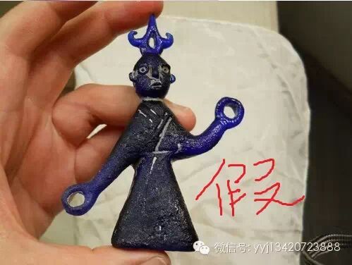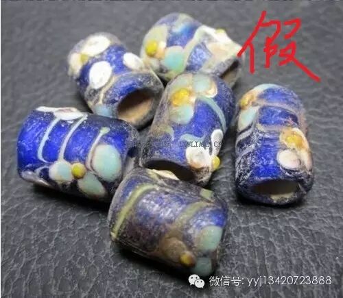 还有一种典型的假货就是人俑、人头、动物俑等。这些有一部分是印尼产的仿古代腓尼基人头珠,只卖几十元一个。正品人头珠的配色很讲究,只有兰、黑、白、黄四色,价格在1000美金以上。至于人俑,有的卖家说是古代佛像,这些纯属胡扯。我所知的琉璃佛像只有杨惠姗大师的作品,那是艺术,不是骗术。