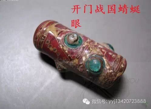 下面两件蜻蜓眼,都是红色的,一件是仿品一件是开门战国货。对比一下应该也很明白了。
