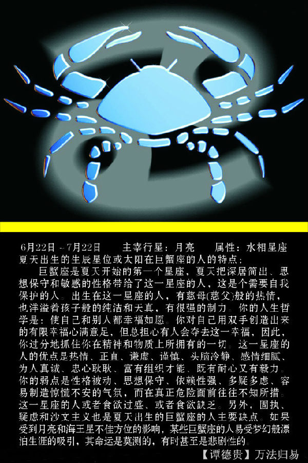 2013年巨蟹座6月运势:运势低迷,日落玄秘宫。逃避问题只会让问题越加明显,也增加你本身就易焦虑的心理压力。有些巨蟹座本月有写作、旅行,也有修养、离职打算。受火海相克,事业、爱情在此月迷茫,不过只要踏实,专心做好眼前事,凡事自然会水到渠成,勿在迷茫中迷失自我。