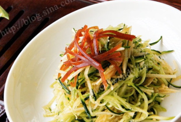 1、黄瓜洗净后切细丝,苹果洗净去皮切细丝,山楂糕切细丝;