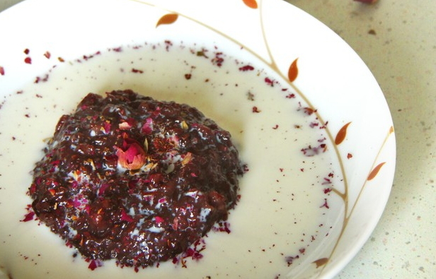 2、用茶水煮紫糯米大米糯米粥,直到软糯水干。我是前一天晚上放到小炖锅里,第二天起来就好啦。自己炖的话,小火2个小时,怎么也好了。甜度按喜好来;