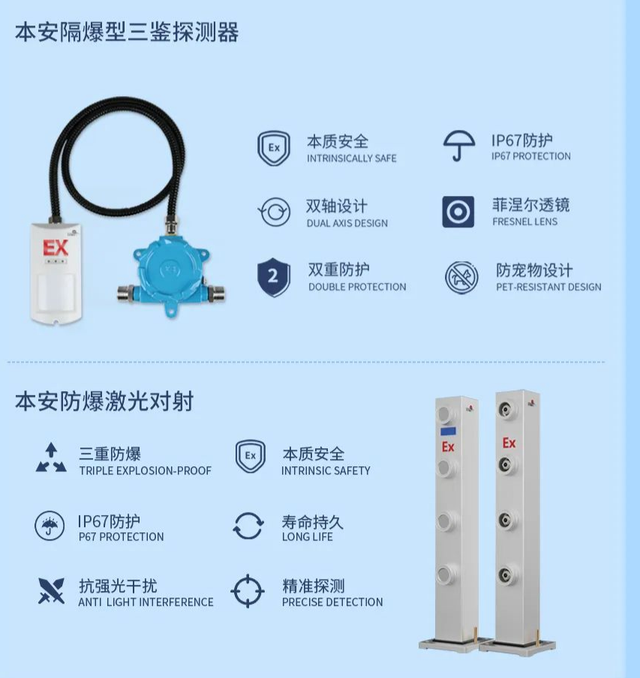 基于现场情况,采用本安隔爆三鉴探测器作为室内前端探测设备。产品采用本安防爆红外微波探测技术,通过国家防爆权威机构鉴定防爆等级,五层防护,误报低、零漏报。布防状态下,当有人进入库房时,可以立即触发报警,向主机和平台发送警情信息,尤其适用于易燃易爆危险区域。