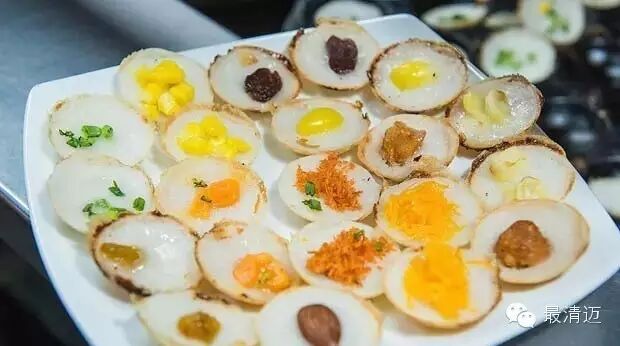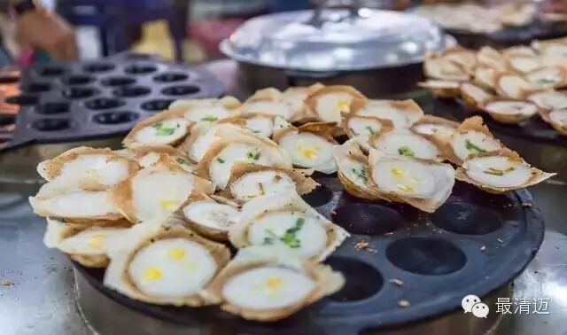 浆米粉糕其实用的原料差不多,不过他是用像章鱼烧那种有一个个半圆形凹槽的铁板,把糯米粉和椰奶调好的浆料倒入凹槽,放点葱花,等烤熟后就可以吃了。由于这道甜点是用烤的,所以表皮会有微焦,吃起来甜中带咸,香味十足!