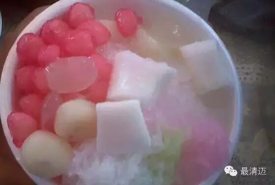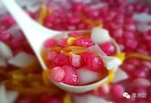 这道甜品在泰国也是非常有名的,红色的荸荠浸泡在白色的椰奶中,看起来就像红宝石般耀眼。这道甜品是用荸荠去皮后切成小块,再放入红色糖水中染色,接着用木薯粉轻轻裹上一层,放入水中煮熟后捞起并放入冰水中冷却,接着放到碗里,把熬煮的浓稠的椰浆淋上去,加入冰块就完成啦!红宝石荸荠椰汤里的荸荠吃起来香香脆脆的,喝几口冰凉香浓的椰奶,真的很消暑喔!
