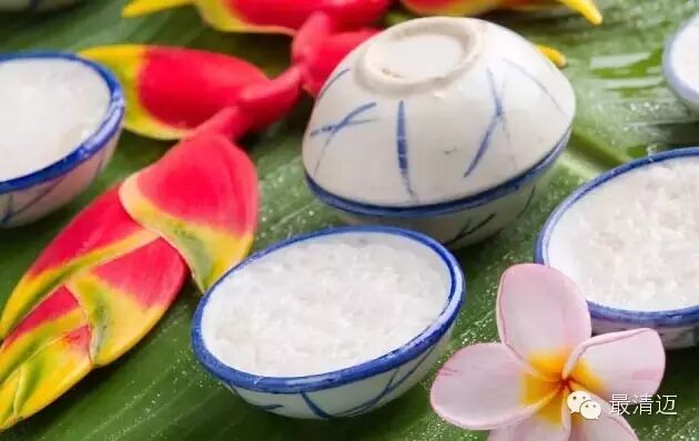 要如何形容椰奶小脆饼这道甜点呢?泰式可丽饼?泰式Tacos?其实这道点心已经有六百多年的历史了,最早可以追溯到大城王朝时期。用米粉、玉米粉、蛋黄、棕榈糖和少许的盐用水调和成面糊,在烧热的铁板上涂上一层薄薄的面糊,中间加入厚椰奶霜,然后铺上切成细丝的蛋丝或椰丝,最后用特制的煎饼刀从烤熟的面皮一边翻往另一边压住定型,看上去像个小元宝就完成啰!
