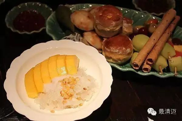 芒果糯米饭已经是最广为人知的泰式甜点了,香甜的芒果配上糯米饭,用椰浆淋在上面搭配着一起吃,芒果、糯米和椰奶的香甜组成了绝妙的好味道。在泰国有两种芒果,一种是青芒果,吃起来青脆带点微微的甜味;另外一种就是黄色的芒果,果肉软嫩汁多香气足,通常都拿来用做芒果糯米这道甜点。蒸好的糯米旁放上切片的芒果肉,再把加入糖和少许盐的椰奶煮沸后放凉和糯米搅拌,并淋在芒果上,就完成了好吃的芒果糯米喔!