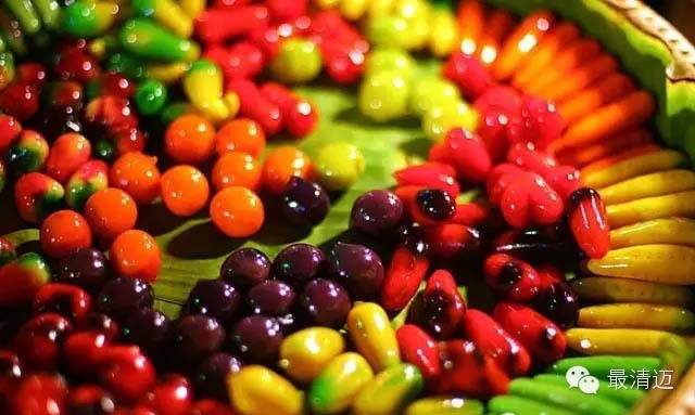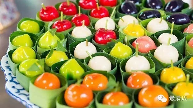 相信大家在泰国的超市或卖场一定可以常常看到,有一些色彩鲜艳但形状却比实物小上许多的蔬菜水果,千万别被骗啰,这可不是什么蜜饯或软糖!其实这是旧时从皇宫内流传出来的甜点呢!泰式和果子是用绿豆泥加上椰奶和糖浆熬煮后再捏制成各种蔬果造型,干燥后再于外部用食用色素添上五颜六色的色彩,最后涂上一层果胶,看起来闪闪发亮就完成啰!泰式和果子不仅好看,吃起来有绿豆沙的香味,还有淡淡的椰奶香,不过这可是非常甜的喔,好处是存放时间比较久,比较不容易腐坏。