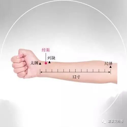 列缺:前臂桡侧缘,桡骨茎突上方,腕横纹上1.5寸处。