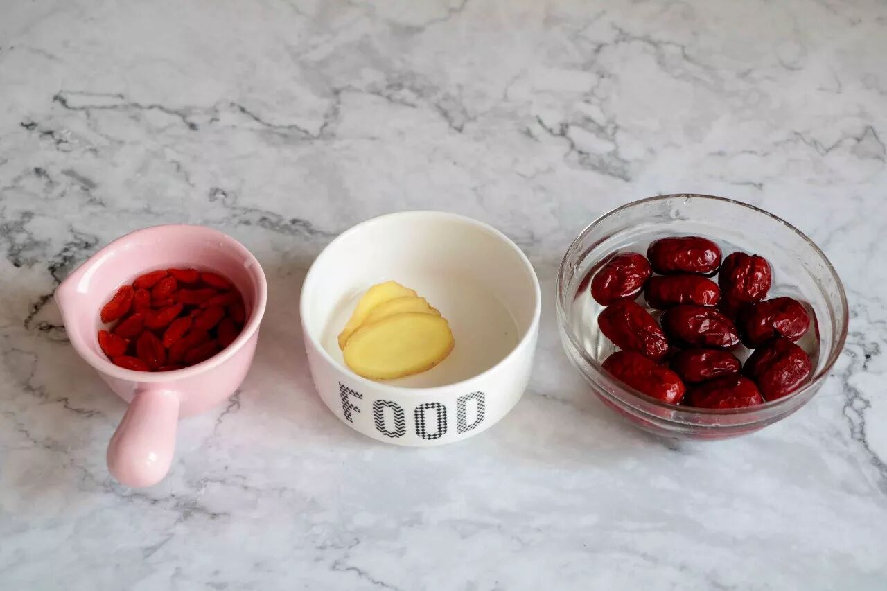 红枣浸泡洗干净、姜切片、枸杞洗净备用