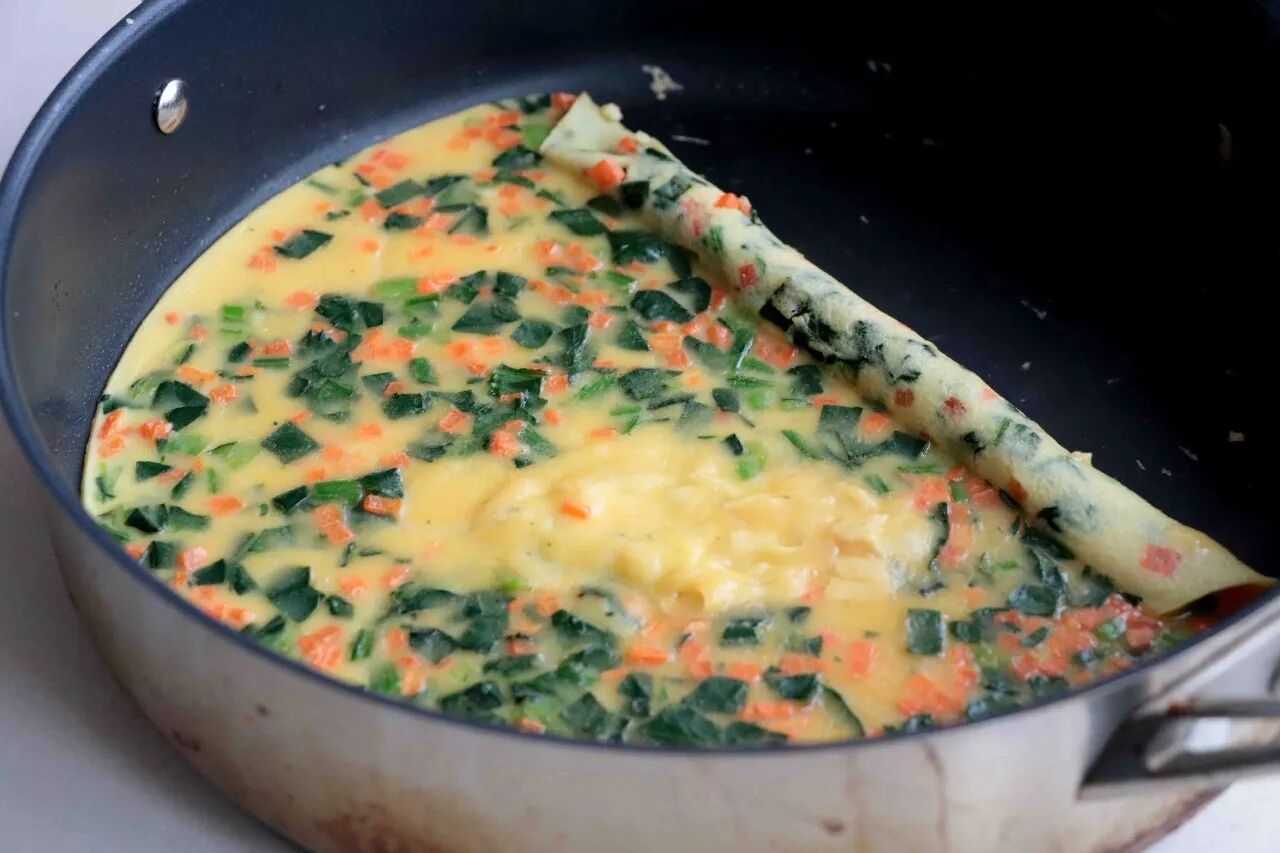 09、卷起3/1鸡蛋饼,再倒入剩下的蛋液混合物,盖上锅盖,直到表面蛋液混合物凝固8成熟之后;