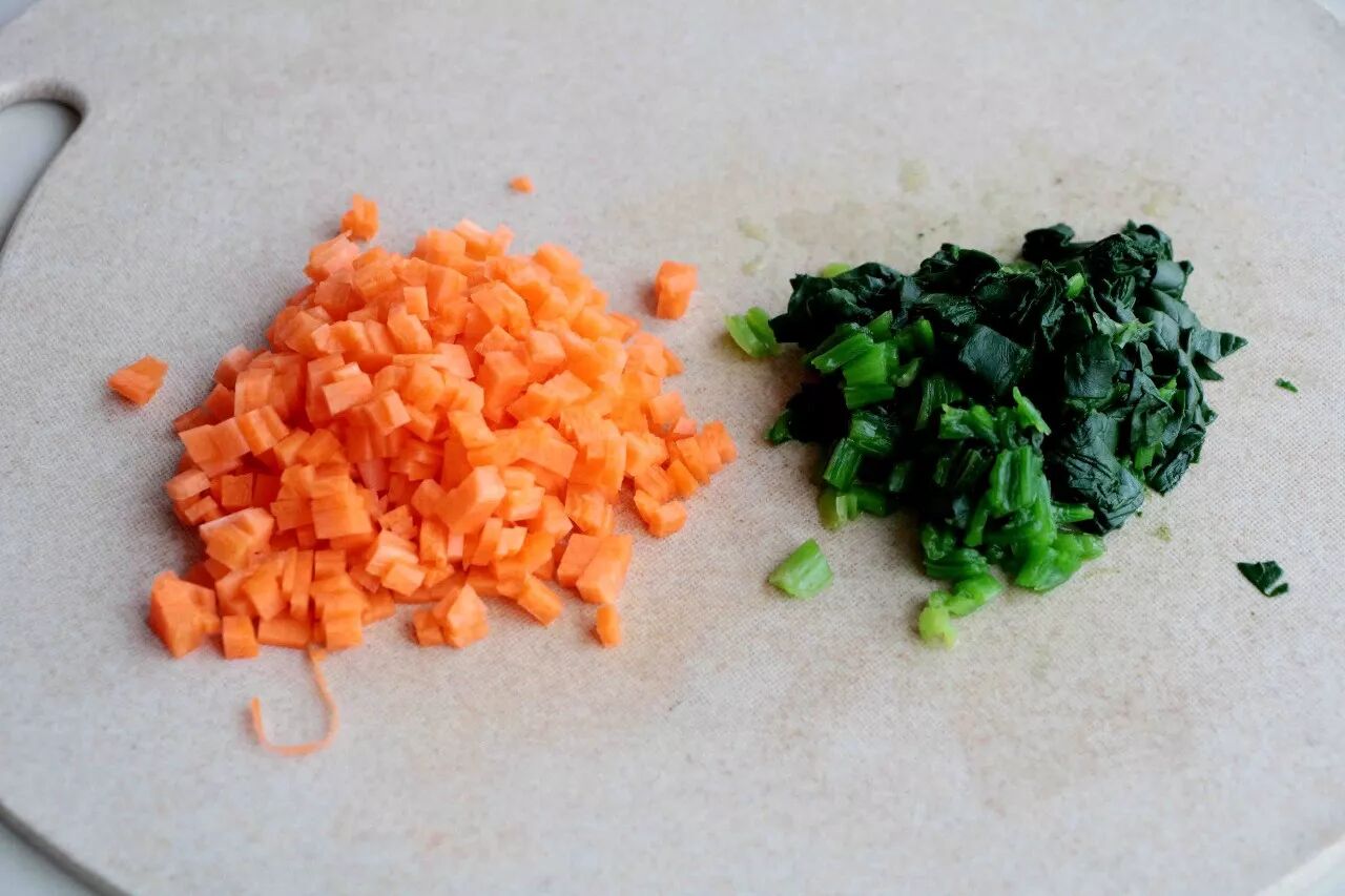 03、胡萝卜切成小颗粒,焯水的菠菜切碎;