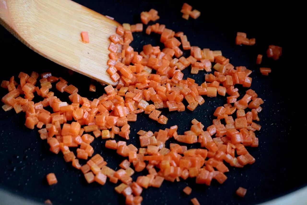 2、胡萝卜丁一定要下锅炒至变软,不然煎的时候煎不熟,也是保证营养的吸收;