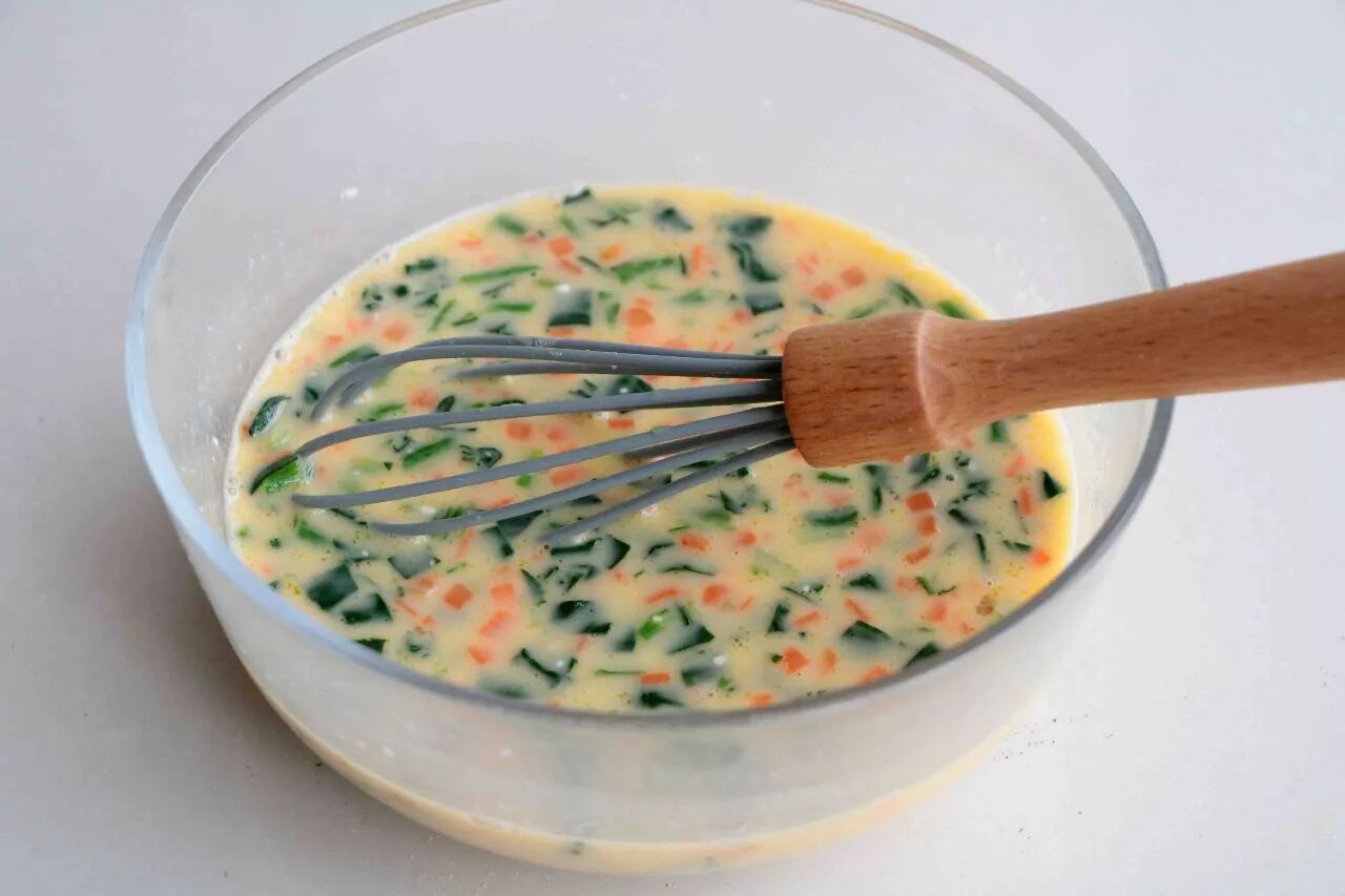 07、搅拌好的蛋糊放入冷却的胡萝卜丁、切碎的菠菜,拌均匀;