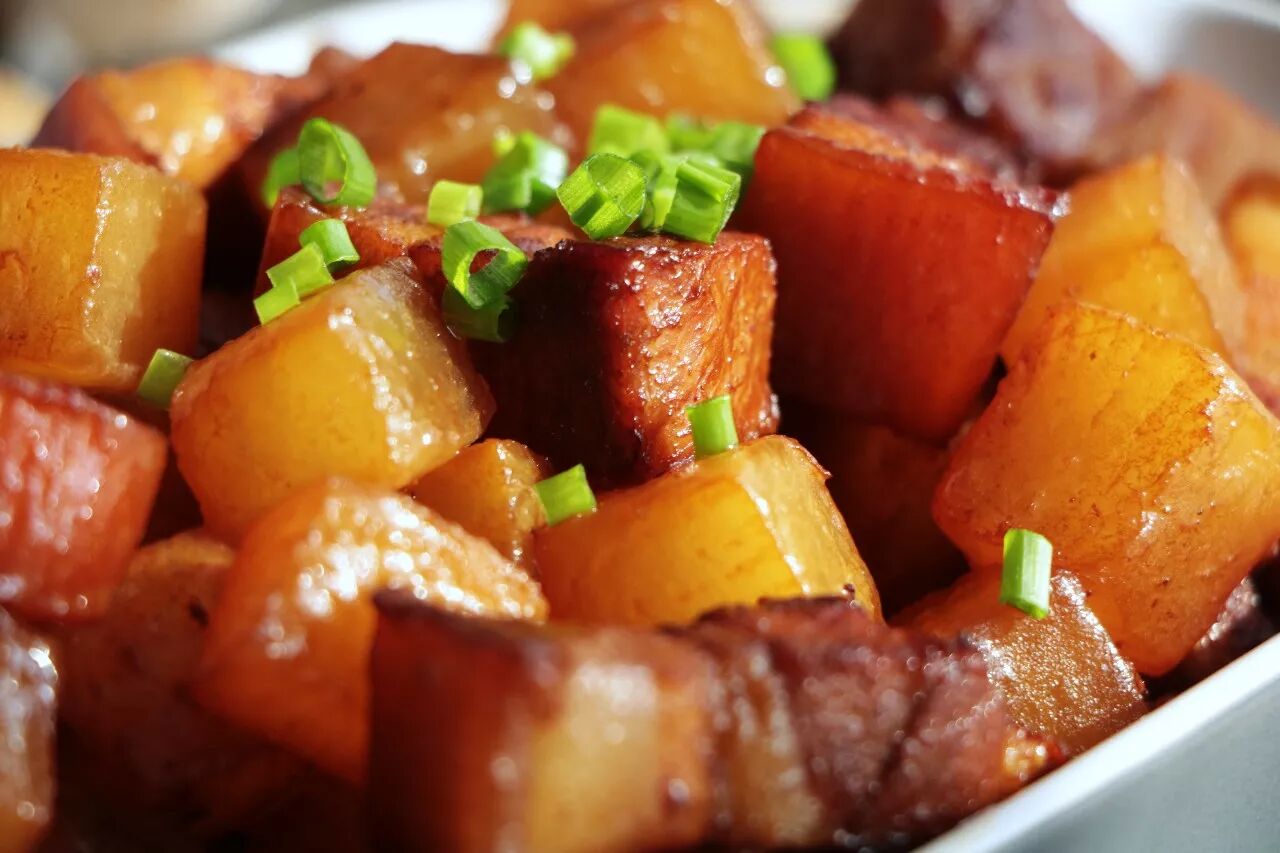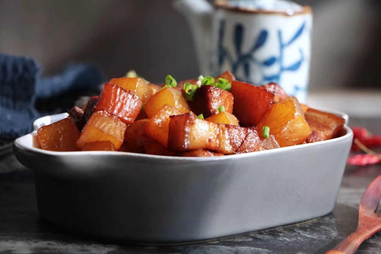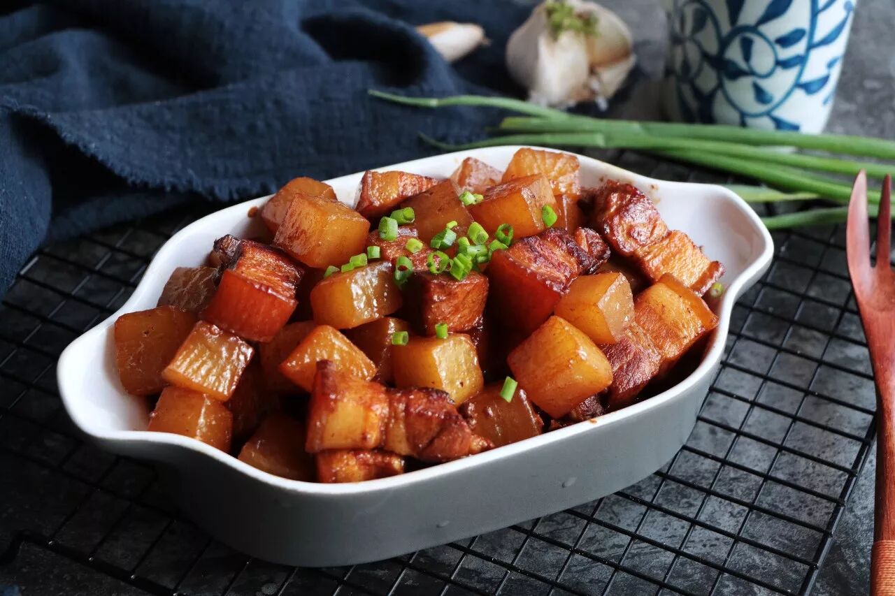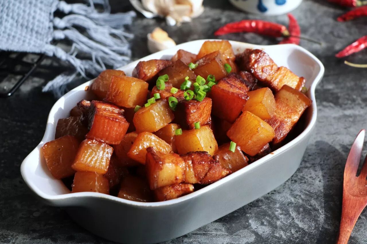 搭配红烧肉吃不仅味美,而且可以吸收油脂,还可以增加食欲;对养胃和消化又有很好的作用;另外常吃白萝卜还可以有美白的作用哦;多吃好处实在太多了;