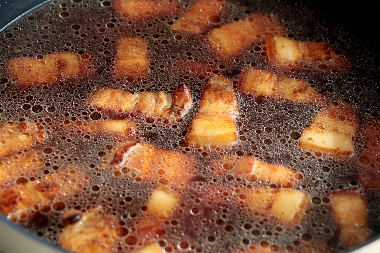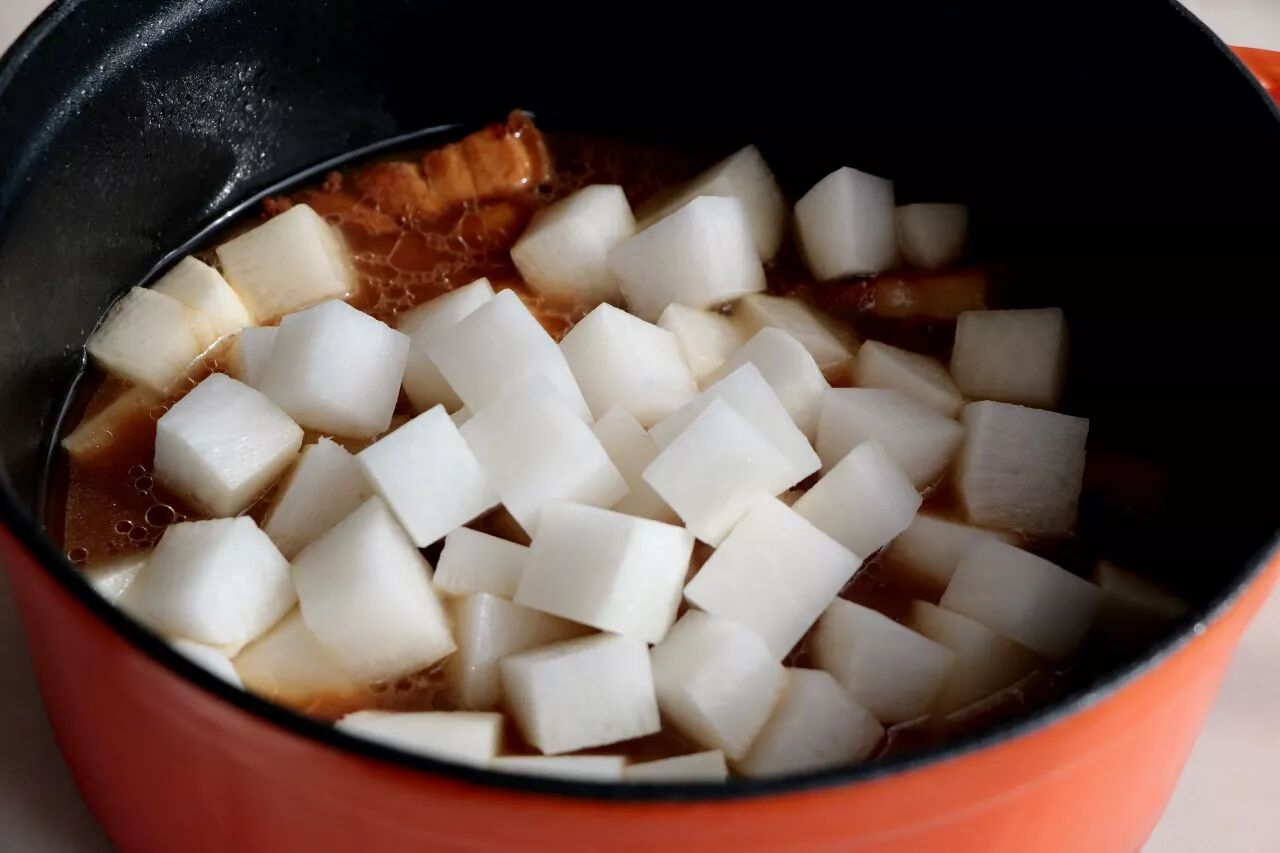 11、烧至五花肉7-8成熟时,倒入白萝卜,放入适量的盐,继续焖煮;