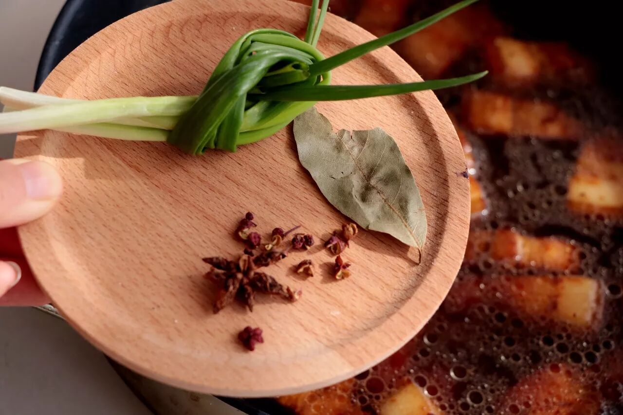 10、放入生抽、葱结、花椒、八角、一片香叶,盖上锅盖大火烧开,转中火烧;