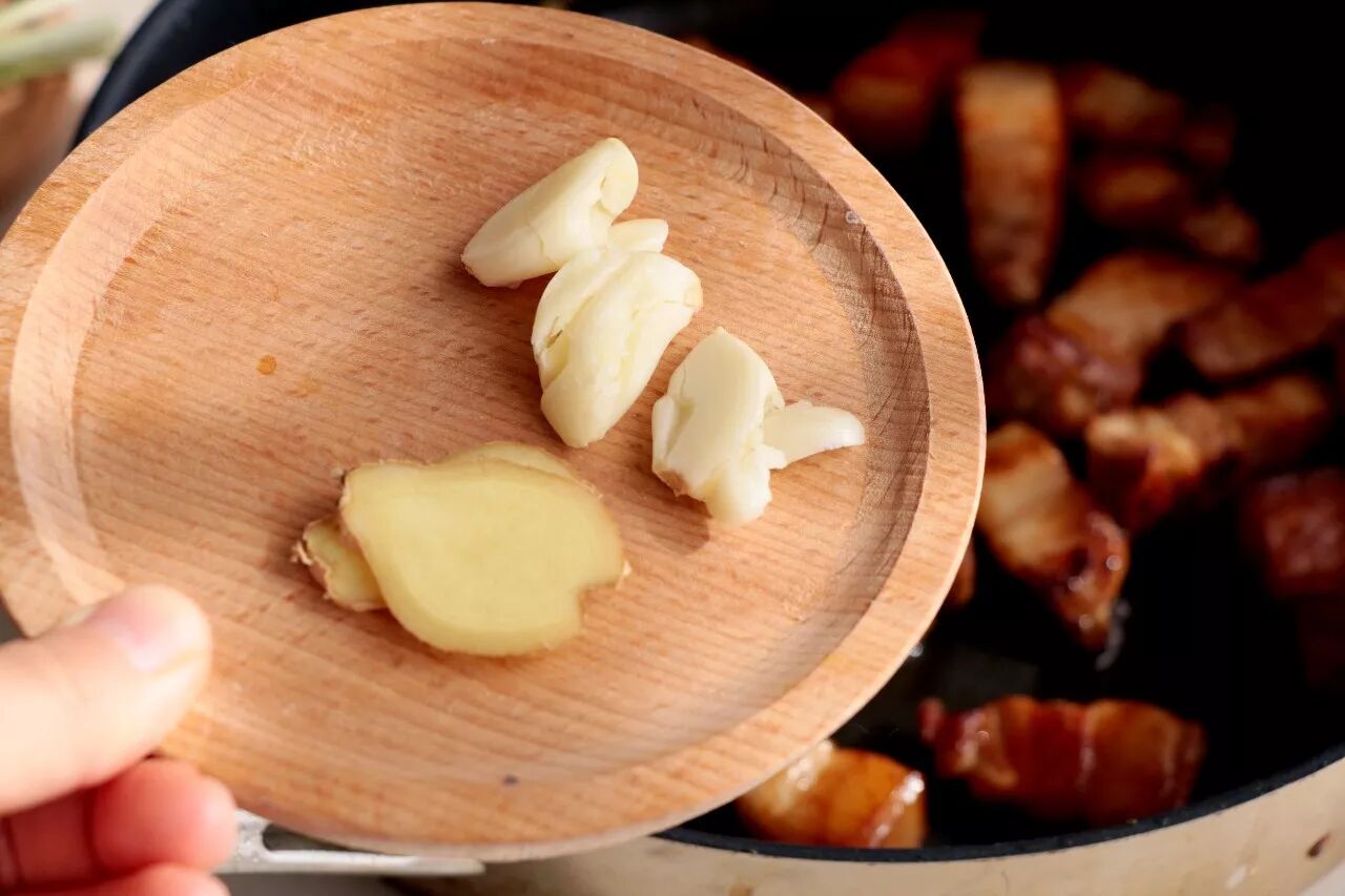 08、放入拍碎的大蒜。2片生姜翻炒出香味;