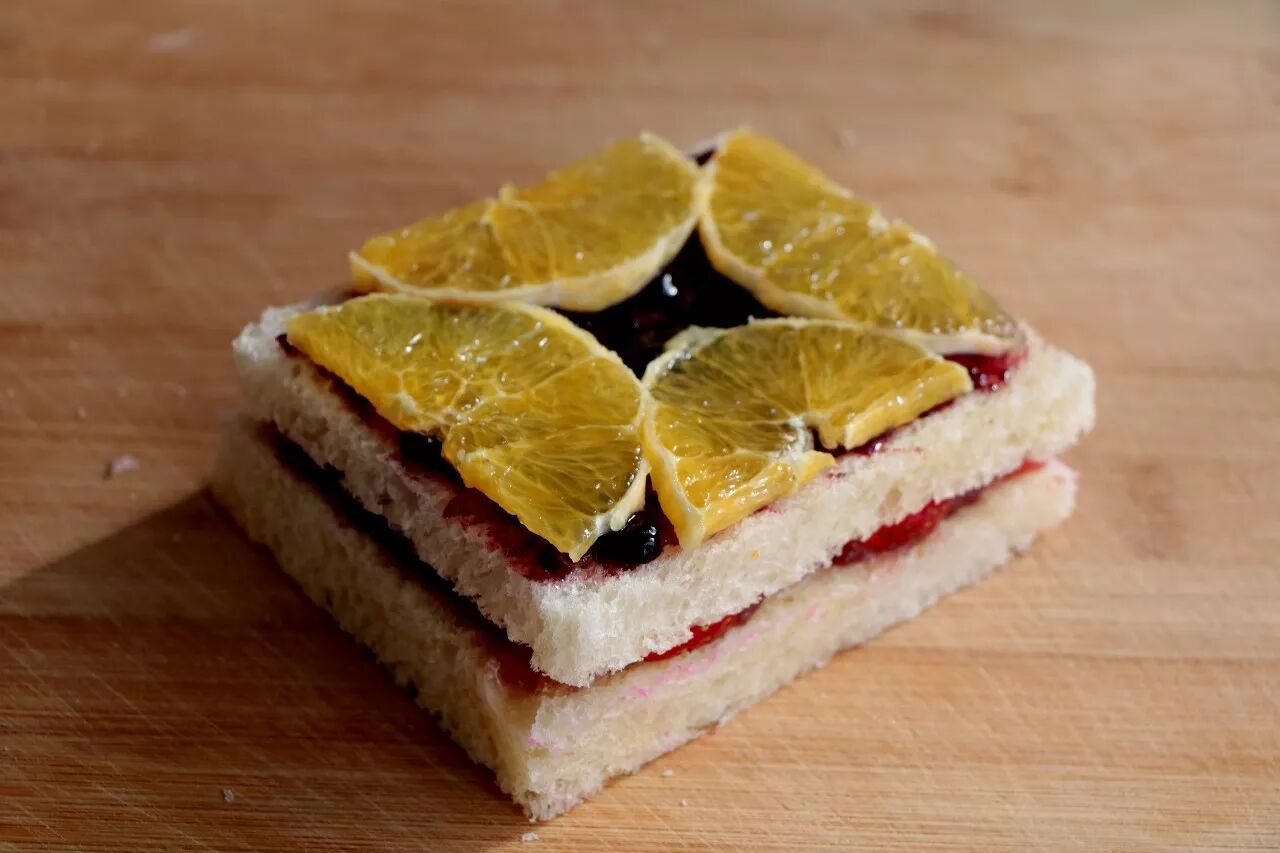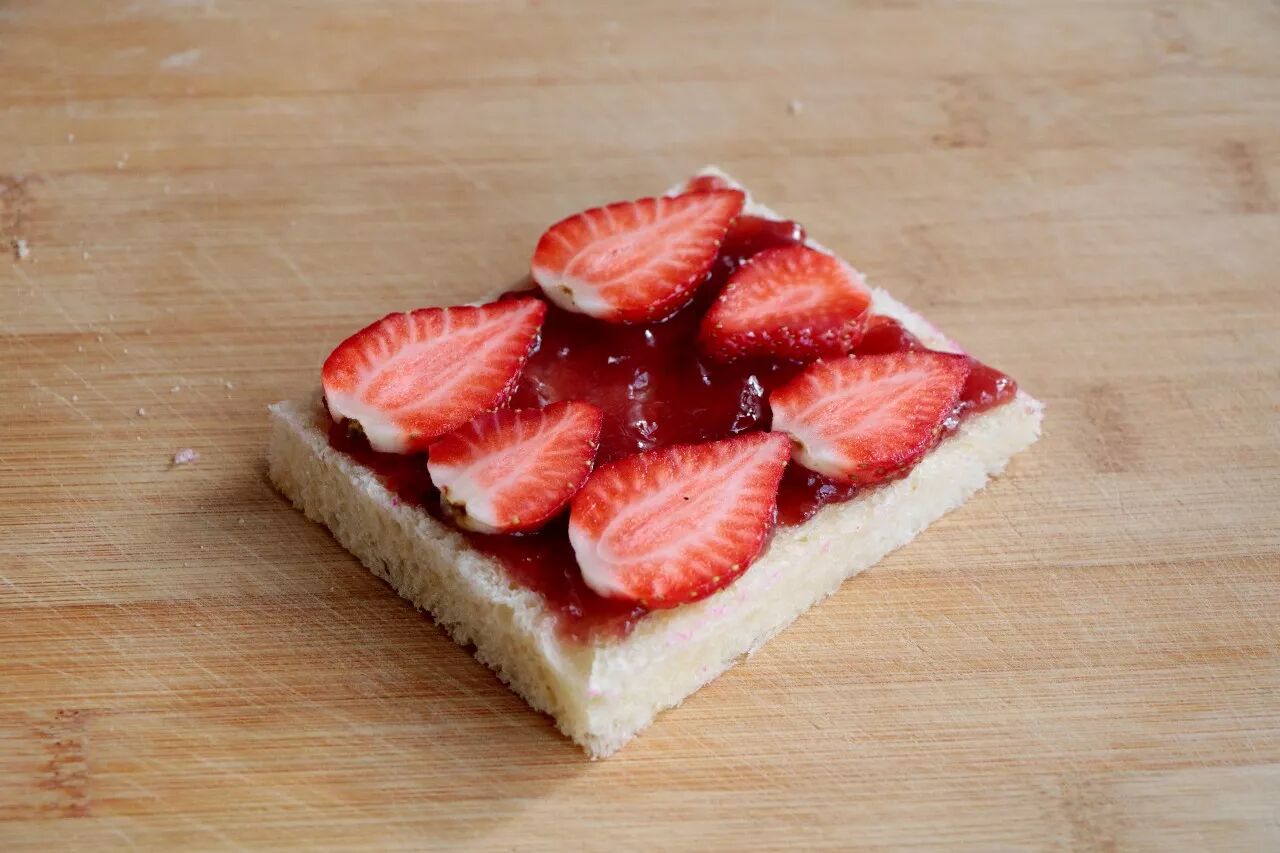 再放一片吐司,涂一层果酱,放自己洗好的水果;