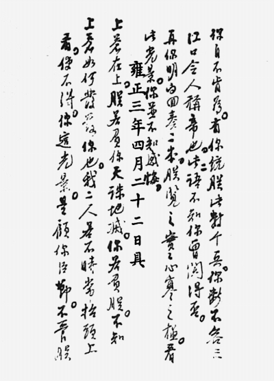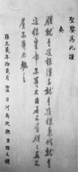 更为关键的是,雍正对奏折保密的坚持。奏折既然涉及政策的制定和执行、涉及官员的取舍,也就决定了它的保密性。康熙十分重视奏折的保密性,不时叮嘱苏州织造李煦等“凡有奏贴,万不可与人知道”。雍正更是一再以此要求具折人,在朱批中一再告诫臣下:“慎密二字,最为要紧,君不密则失臣,臣不密则失身,可不畏乎?”四川巡抚鄂昌的叔叔鄂尔泰是雍正的宠臣,主持了历史上有名的“改土归流”工作,累官云贵总督、内阁首辅。但在命鄂昌书写奏折的朱批上,雍正说:“密之一字,最为紧要,不可令一人知之,即汝叔鄂尔泰亦不必令知。”甚至骨肉至亲也不应示知,广东布政使王士俊曾申明:“一切奏折无不倍加谨密,即臣子弟同在署中者皆未尝得窥底里。”