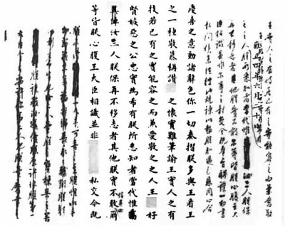 在很多人心目中,除了康熙、雍正之外,其他清帝的朱批都是呆板乏味,只有“知道了”、“依议”、“该部知道”等套话。其实不然,谨以咸丰为例,1854年,曾国藩率水军进攻驻扎靖港的太平军遭遇大败,羞愤之下投水自尽,被救起后又写了遗折准备再度自杀。但事后奏报军情时,没有将遗折一起寄送。咸丰看后,不明所以,便毫不客气地朱批道“此奏太不明白,岂已昏聩耶!”在江西被石达开围困并与当地官员关系紧张,曾国藩心灰意冷,1857年借父亲病故之机离开军营回湖南老家。之后,面对咸丰的征召一再借故推脱、不肯出山,直至1858年六月才肯带兵救援浙江。咸丰得知后,在曾国藩的《恭报起程日期折》上朱批“汝此次奉命即行,足征关心大局,忠勇可尚。”