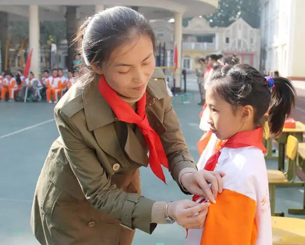 大队辅导员对新一届大队委员们表示祝贺并授予大队委标志。“一条杠杠一份责任,标志戴在身上,嘱托记在心间,新一届大队委将接过接力棒,承担起伙伴的期望。”