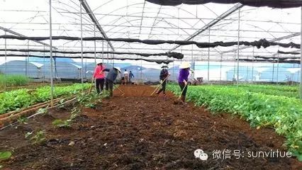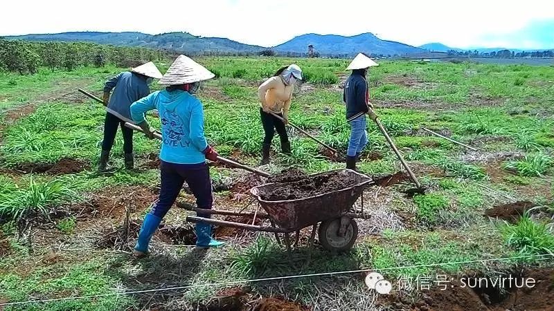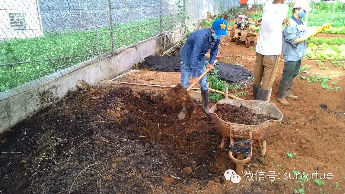 阿波罗咖啡庒园的工作人员正在把以咖啡渣、猫屎…及其他天然有机物发酵而成的天然有机肥料分送到咖啡园及温室蔬菜园中。