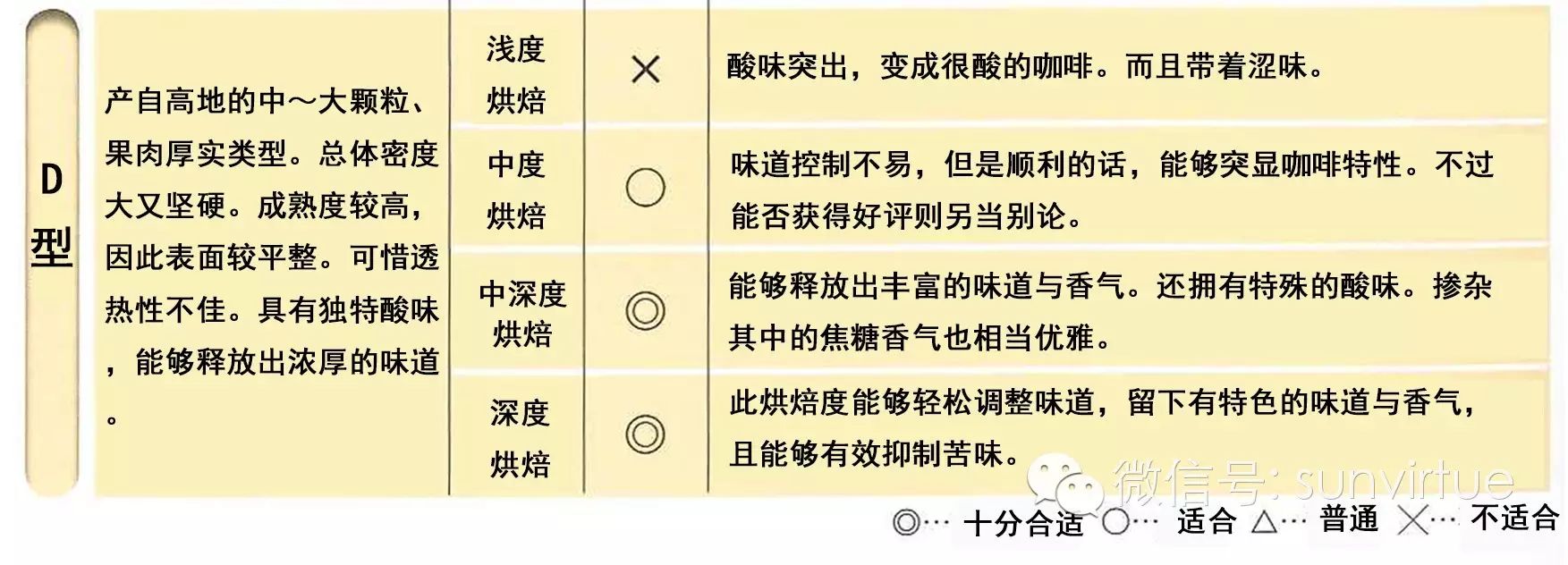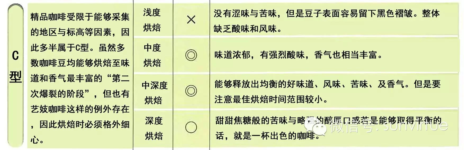 以商业咖啡来说,C、D型比A、B型的烘焙难度更高。精品咖啡大致上也是一样,不过有些情况较窄,因此反而困难。精品咖啡多半是习性强烈又神经质的脱序者(难以归类)。