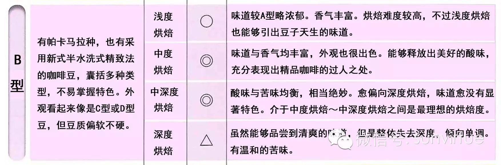 以上是几种类型的概要,只适用于一般流通的商业咖啡豆,不能够直接套用在精品咖啡上,大方向的架构或许通用,不过精品咖啡几乎都是高地产的硬质豆,较少符合系统咖啡学中A型、B型的柔软豆子。我们可想成事精品咖啡的A型不等于商业咖啡的B型,而是稍微偏A的B型。精品咖啡的B型相当于商业咖啡的C型。整体来说大约是往D型偏移半型。