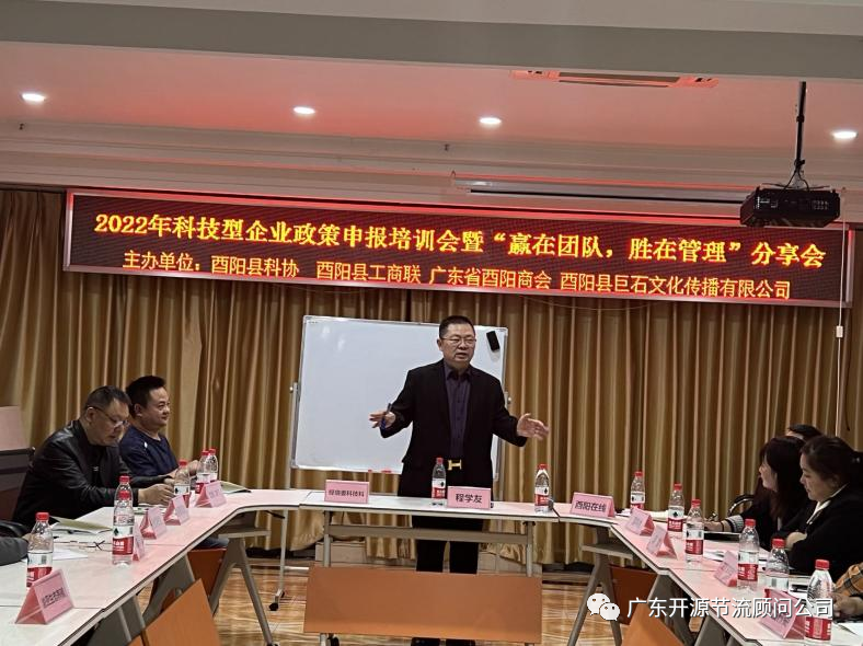 为了宣传解读国家《科技型中小企业评价办法》,推进实施酉阳县科技型企业认定工作,让企业更好的了解国家科技型企业的评价条件、标准和程序。10月26日,酉阳在线创新创业服务中心主办了一场主题为“2022年科技型企业政策申报培训会暨‘赢在团队,胜在管理’”专题沙龙会。https://mmbiz.qpic.cn/mmbiz_png/VaoaMoSzqwnn9zWlYhvqaSibSniam9VML3TBjOWhjC6YL03MER1P61icF7yDC5QbgT1VZDr0icwr2Kt3en841k1icZw/640?wx_fmt=png程董通过深入浅出、引经据典的内容输出方式,为酉阳县企业家奉上了一场丰富的经管知识盛宴。