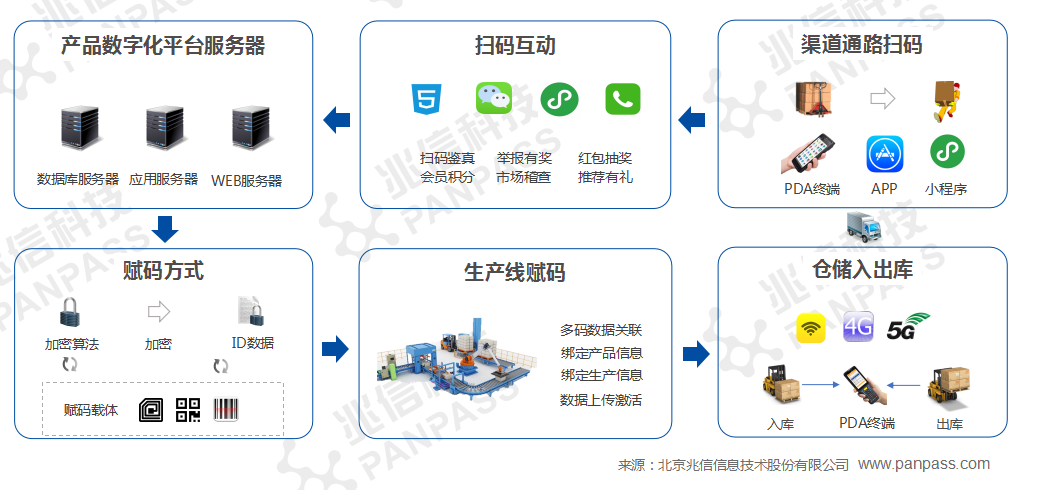 兆信科技针对奶企现场环境复杂、生产速度快等特点提出了更为完善的解决方案,利用移动互联网、区块链、大数据、AI及云计算,自动化赋码采集数据,减少人工操作程度,降低出错率,并同步物流、出入库信息,保证数据及时、准确。通过产品质量追溯、产品包装赋码、仓库管理、防窜货管理系统的全面运行,奶企能够建立智能化的追溯平台,实现生产环节追溯与渠道流向追溯等功能。
