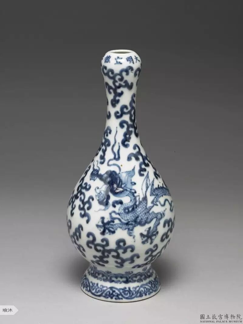 明嘉靖蒜头瓶是肩部有堆塑蟠螭装饰;