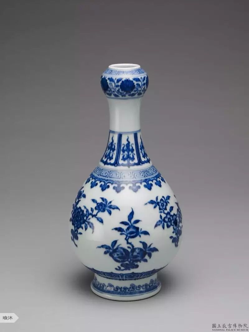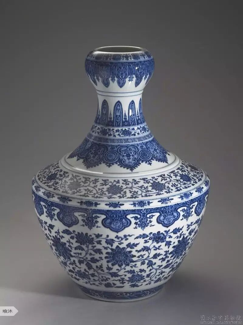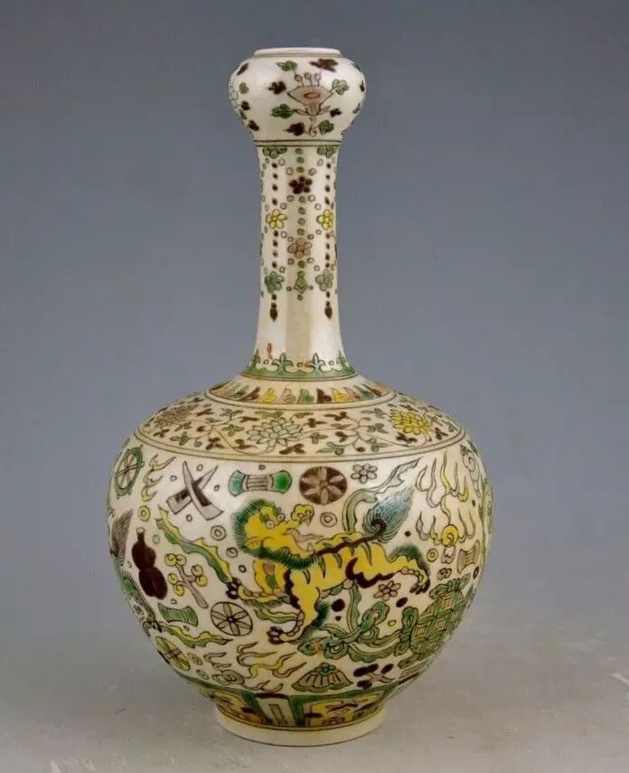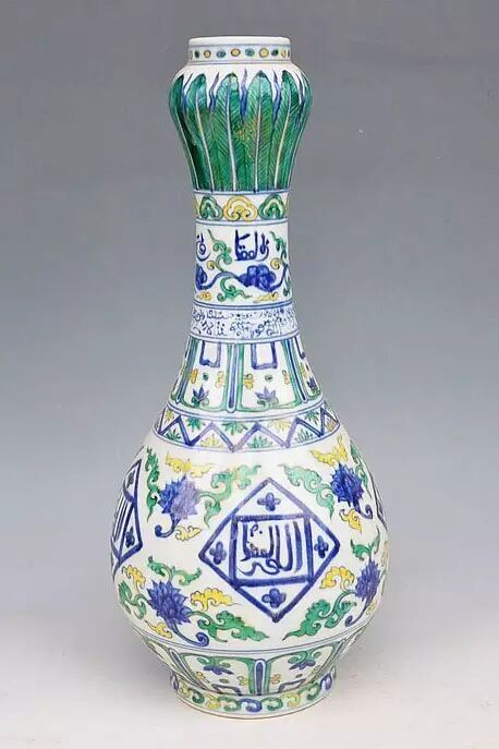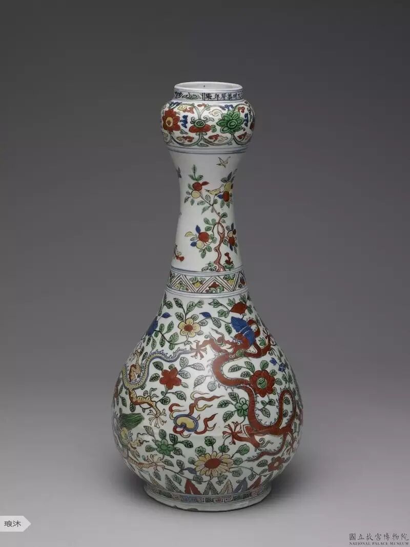 明万历蒜头瓶,趋于简化,口部已无蒜头了,但器形高大,以青花五彩为多见。