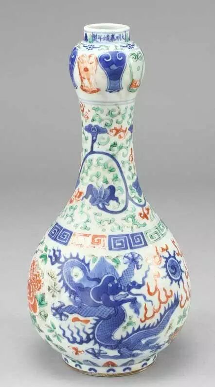 明嘉靖官 青花五彩龙纹蒜头瓶