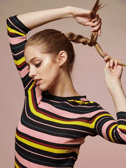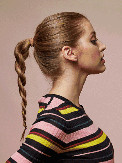 在橡皮筋上方将头发分开一个空隙,空隙位置稍微偏左侧,将马尾翻转进空隙。▼