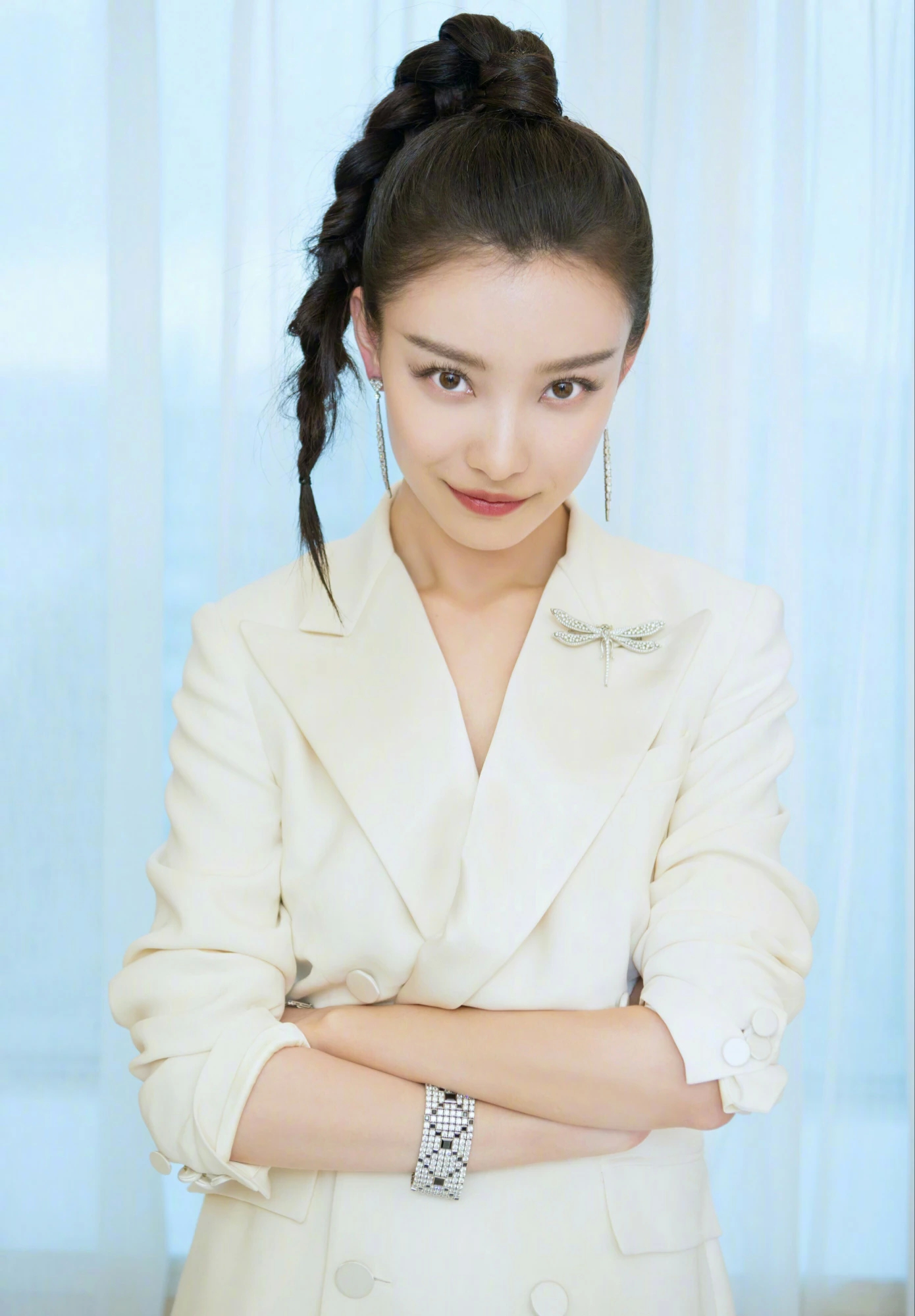 这款发型在倪妮身上就很好看,像是扎漏了一缕发束似的,看上去萌感十足。▼
