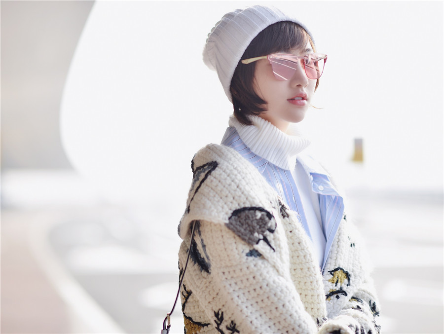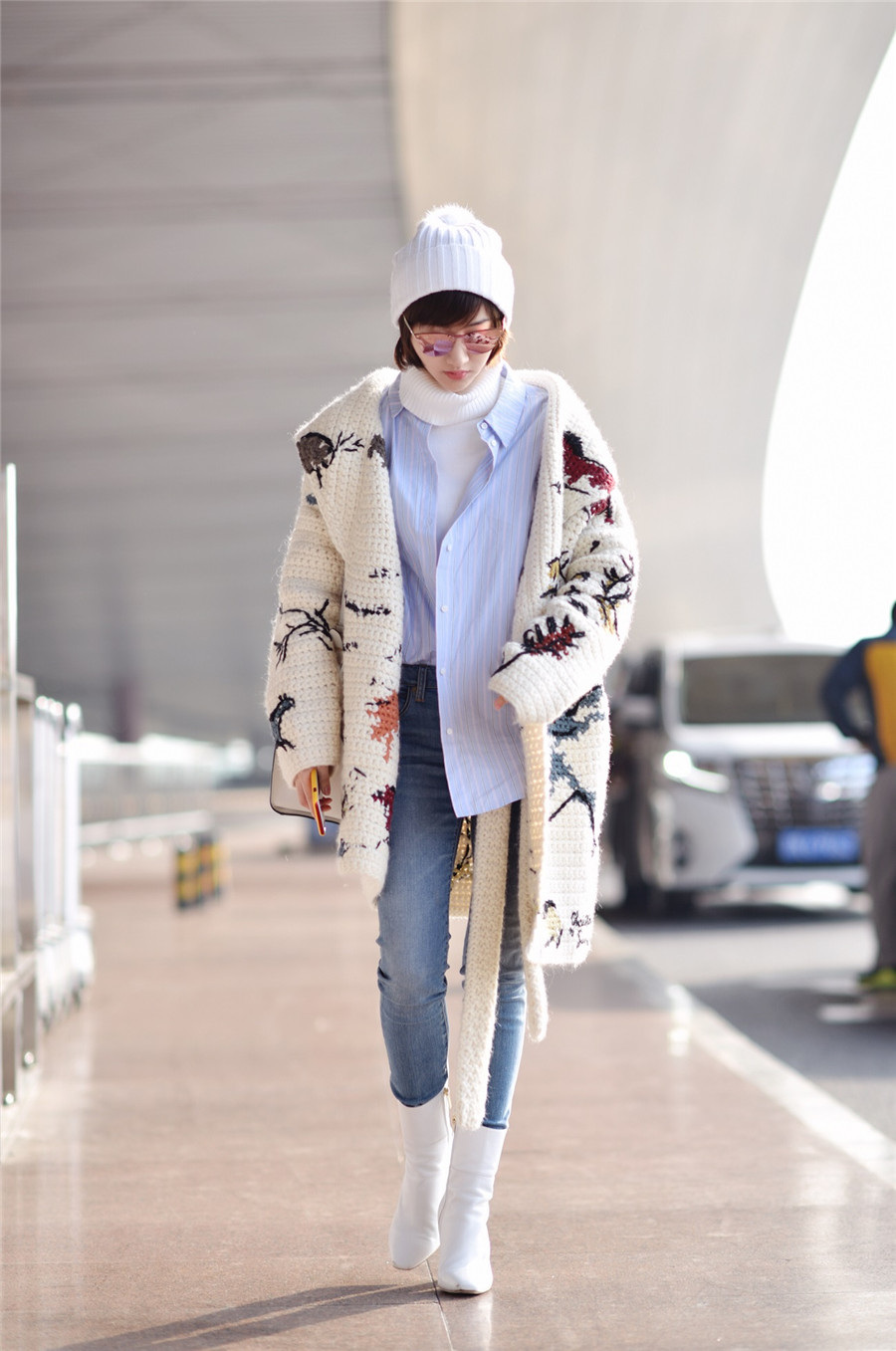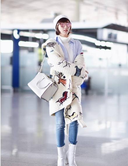 近日,景甜现身机场,身着高领毛衣,搭配白色小鹿毛线针织外套,戴白色毛线帽,又潮又萌,白色针织腰带挂在腰间,像是拖了一条小尾巴,可爱吸睛。